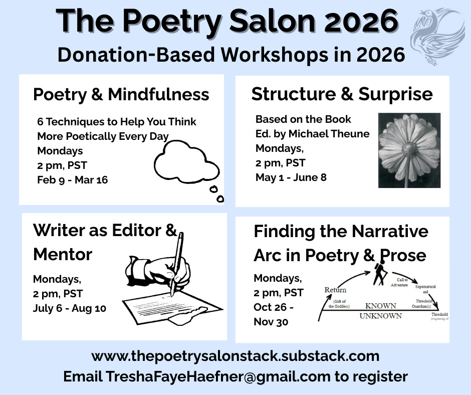 (To register, make a donation of any amount, and then email TreshaFayeHaefner@gmail.com to get the link. Donations help fund affordable workshops and scholarships for our fellow writers.)